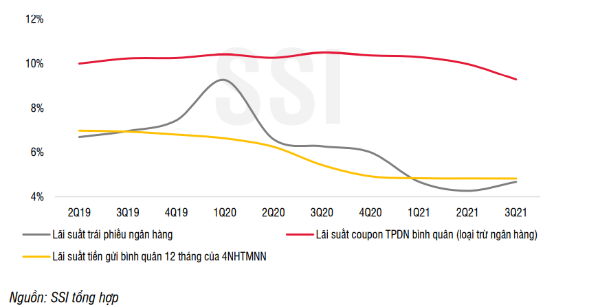 Bên cạnh đó, nhu cầu đầu tư TPDN từ các nhà đầu tư cá nhân vẫn duy trì tích cực khi chênh lệch giữa lãi suất phát hành TPDN và lãi suất tiền gửi giữ ở mức cao. Chênh lệch giữa lãi suất TPDN (loại trừ ngân hàng) với lãi suất tiền gửi bình quân lên tới 4%/năm, cho thấy dư địa dòng tiền cá nhân tìm đến những tài sản đầu tư tài chính như TPDN vẫn còn rất lớn.