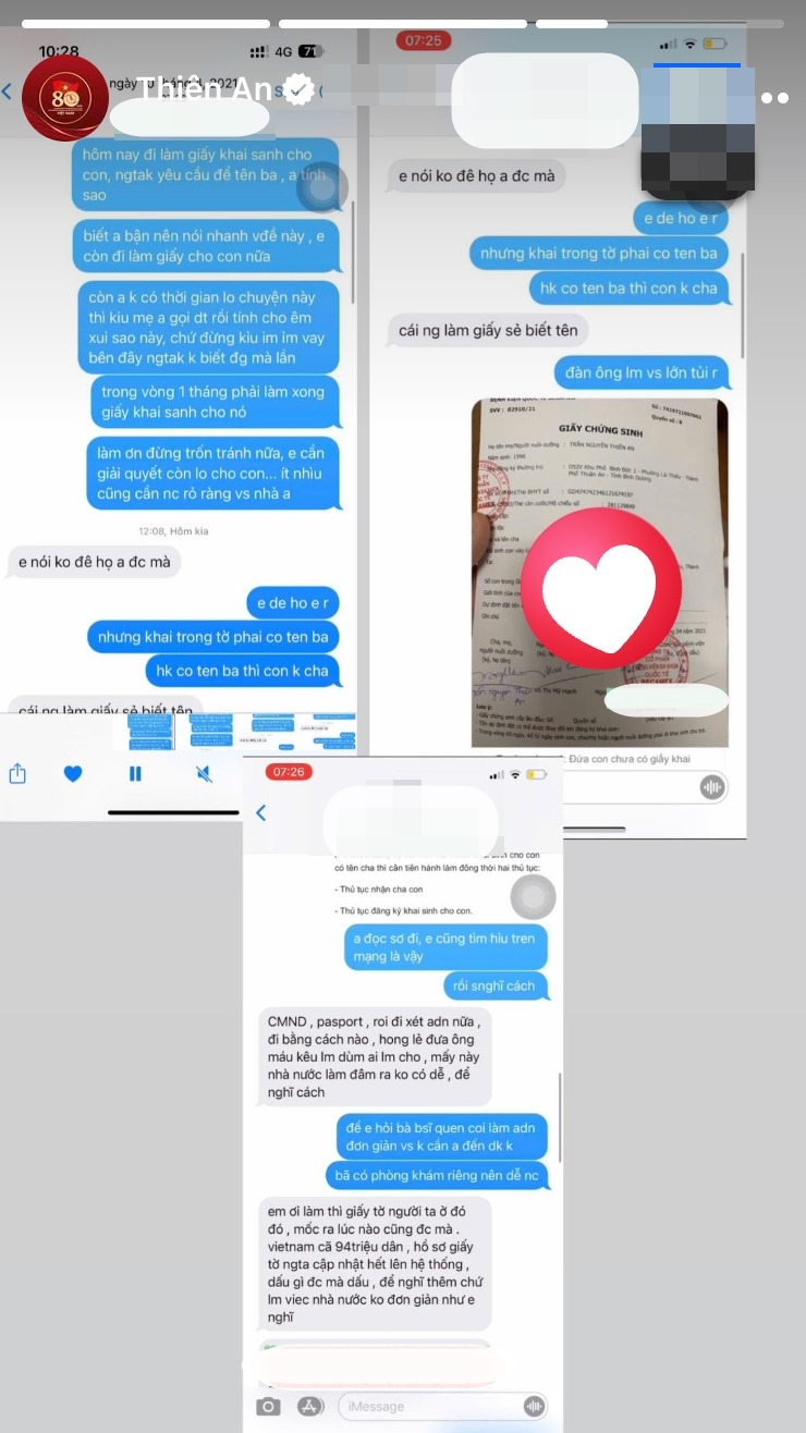 Được biết những tin nhắn Thiên An công khai có mốc thời gian năm 2021, khi cô sinh con gái Sol. Trong đó, cô công khai giấy chứng sinh và những thông tin liên quan. Ở một đoạn tin nhắn, Thiên An viết cho đối phương: "Hôm nay đi làm giấy khai sinh cho con, người ta yêu cầu để tên ba, anh tính sao", "Làm ơn đừng trốn tránh nữa, em cần giải quyết còn lo cho con",...