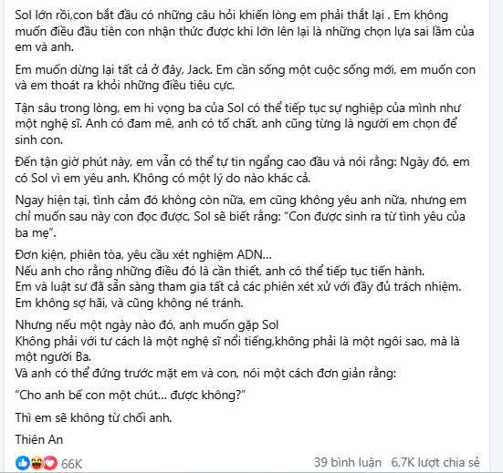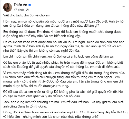Đồng thời, Thiên An mong muốn chấm dứt mọi tiêu cực, để cô và con được sống bình yên. Dù không còn tình cảm, cô khẳng định Sol được sinh ra từ tình yêu. Nữ diễn viên cũng sẵn sàng tham gia các thủ tục pháp lý nếu Jack yêu cầu, nhưng hy vọng một ngày anh có thể đến gặp con với tư cách người cha, không phải nghệ sĩ.