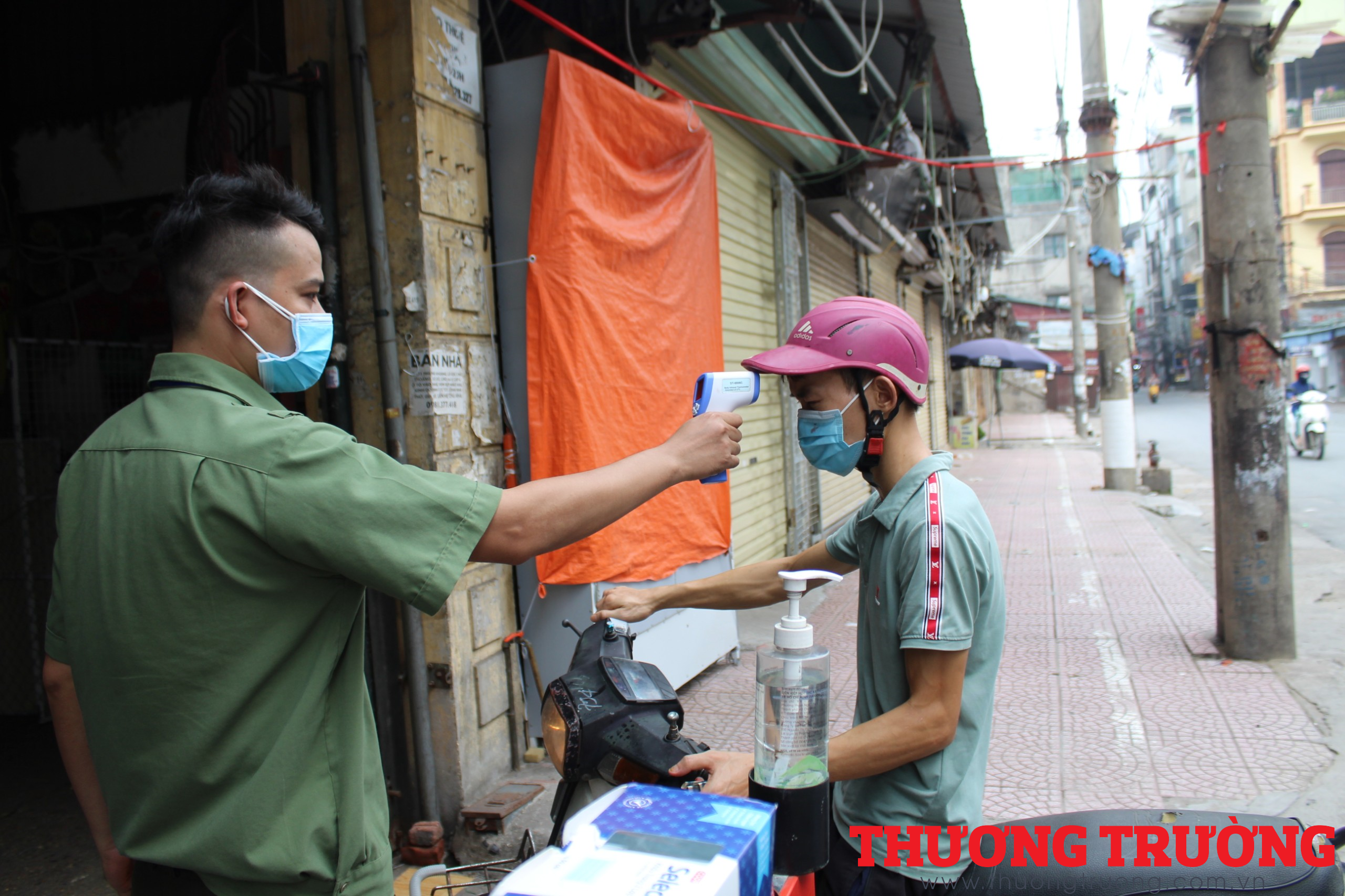 Đi chợ Phùng Khoang trong thời điểm này người dân sẽ phải sát khuẩn và được đo thân nhiệt. Khi xét thấy không có biểu hiện nào bất thường thì mới được phép vào chợ