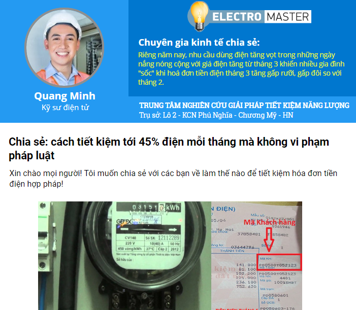Vào ngẫu nhiên một trang bán hàng, chúng tôi tìm hiểu về sản phẩm được bán tại đây với tên gọi là Electricity Saving Box. Tại đây, một kỹ sư xưng tên Quang Minh, chia sẻ cách tiết kiệm tới 45% điện mỗi tháng mà không vi phạm pháp luật nhằm quảng cáo cho sản phẩm Electricity Saving Box. Sản phẩm này được giới thiệu có nguồn gốc xuất xứ từ Đức, sản xuất và lắp ráp hoàn toàn từ nước ngoài, nhập khẩu nguyên chiếc về Việt Nam. Với công dụng này, với mức tiêu thụ điện của một hộ gia đình có thể tiết kiệm đến hàng triệu đồng, mà không vi phạm pháp luật. Nếu thật sự thiết bị này có thể giảm đến gần nửa lượng điện tiêu thụ trong khi các đồ dùng trong gia đình vẫn hoạt động bình thường thì sẽ là một giải pháp tuyệt vời để giảm tải cho lưới điện quốc gia?