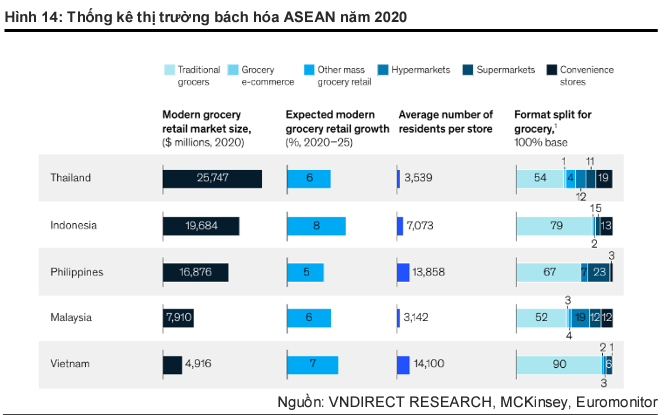 Báo cáo của MCKinsey và dữ liệu của Euromonitor cho thấy, năm 2020, 90% thị phần của thị trường bách hóa thuộc về cửa hàng truyền thống, trong khi chuỗi bán lẻ bách hóa hiện đại chỉ chiếm khoảng 1% thị phần. VNDirect ước tính thị phần của các chuỗi bán lẻ bách hóa hiện đại đã đạt thị phần 5% trong tổng mức tiêu thụ các sản phẩm bách hóa khoảng 2.096 nghìn tỷ đồng vào năm 2022, khẳng định tiềm năng phát triển mạnh mẽ của các chuỗi bán lẻ tạp hóa hiện đại tại Việt Nam.