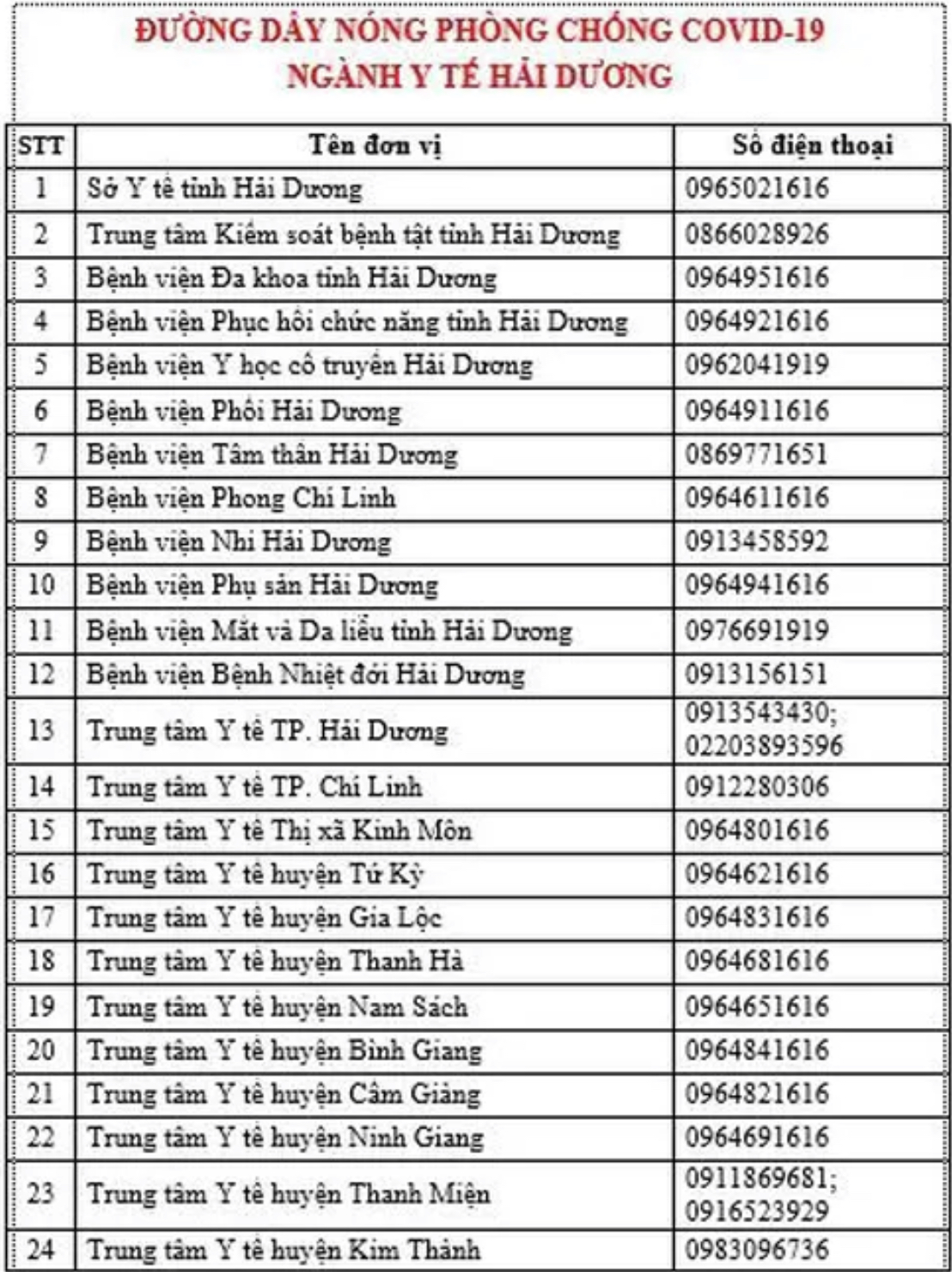 Đường dây nóng phòng chống COVID-19 ngành Y tế Hải Dương.