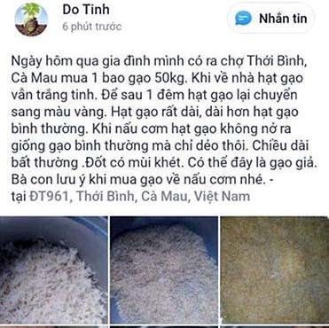 Trước đó, ngày 3/11, thông qua mạng xã hội zalo, tài khoản Do Tinh đã đăng tải thông tin: “Ngày hôm qua, gia đình mình có ra chợ Thới Bình, Cà Mau mua 1 bao gạo 50 kg. Khi về nhà, hạt gạo vẫn trắng tinh. Để sau 1 đêm, hạt gạo lại chuyển sang màu vàng. Hạt gạo rất dài, dài hơn hạt gạo bình thường. Khi nấu cơm, hạt gạo không nở ra giống gạo bình thường mà chỉ dẻo thôi. Chiều dài bất thường. Đốt có mùi khét. Có thể đây là gạo giả, bà con lưu ý khi mua gạo về nấu cơm nhé”.