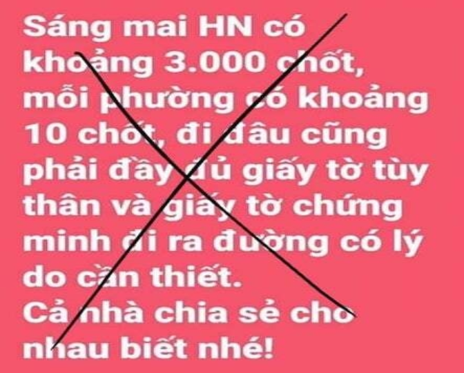 Cụ thể, thông tin được đăng tải với nội dung "sáng mai Hà Nội có khoảng 3.000 chốt, mỗi phường có khoảng 10 chốt, đi đâu cũng phải có đầy đủ giấy tờ tuỳ thân và chứng minh lý do ra đường có lý do cần thiết. Cả nhà chia sẻ cho nhau biết nhé".