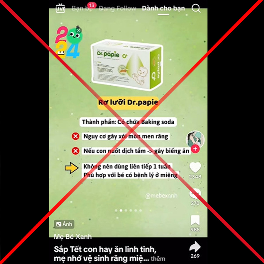 Bà H.T.T.H, chủ tài khoản kênh Tik Tok “Mẹ Bé Xanh” đã bị xử phạt hành chính sau khi thông tin sai sự thật về sản phẩm “Gạc răng miệng Dr.Papie” có chứa Baking Soda (NaHCO3) gây hại tới sức khỏe trẻ sơ sinh và khuyến cáo không nên dùng liên tiếp trong một tuần. Đây là lời cảnh tỉnh nghiêm khắc cho các cá nhân và tổ chức có ý định xuyên tạc, thông tin sai sự thật để cạnh tranh không lành mạnh.