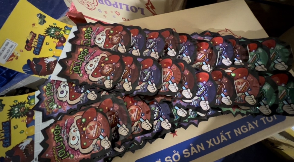 Sản phẩm kẹo Lollipop không hóa đơn chứng từ được bán ngang nhiên tại cơ sở kinh doanh.