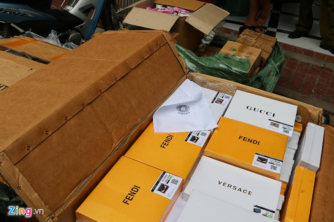 Đồng thời, tại đây còn có 2 thùng chứa khoảng 130 sản phẩm ví, túi xách mang các nhãn hiệu nổi tiếng như Gucci, Versace, Fendi… Những chiếc túi này có đủ hộp, hóa đơn bên trong. Tuy nhiên, theo đánh giá của cơ quan chức năng, số hàng hóa này có dấu hiệu giả mạo nhãn hiệu.