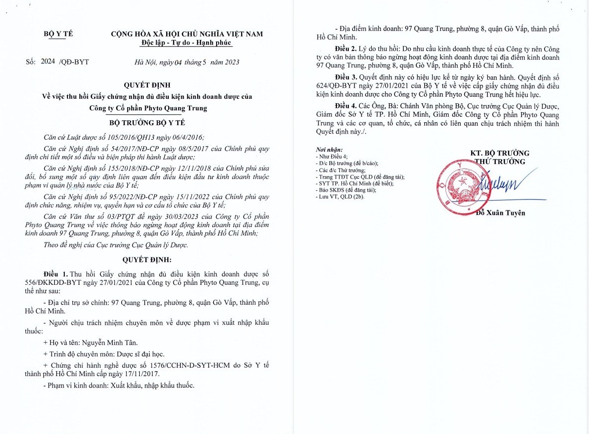 Theo quyết định số 2004/ QĐ-BYT do Thứ trưởng Bộ Y tế Đỗ Xuân Tuyên ký ban hành, Bộ Y tế đã quyết đinh thu hồi Giấy chứng nhận đủ điều kiện kinh doanh dược của Công ty Cổ phần Phyto Quang Trung.