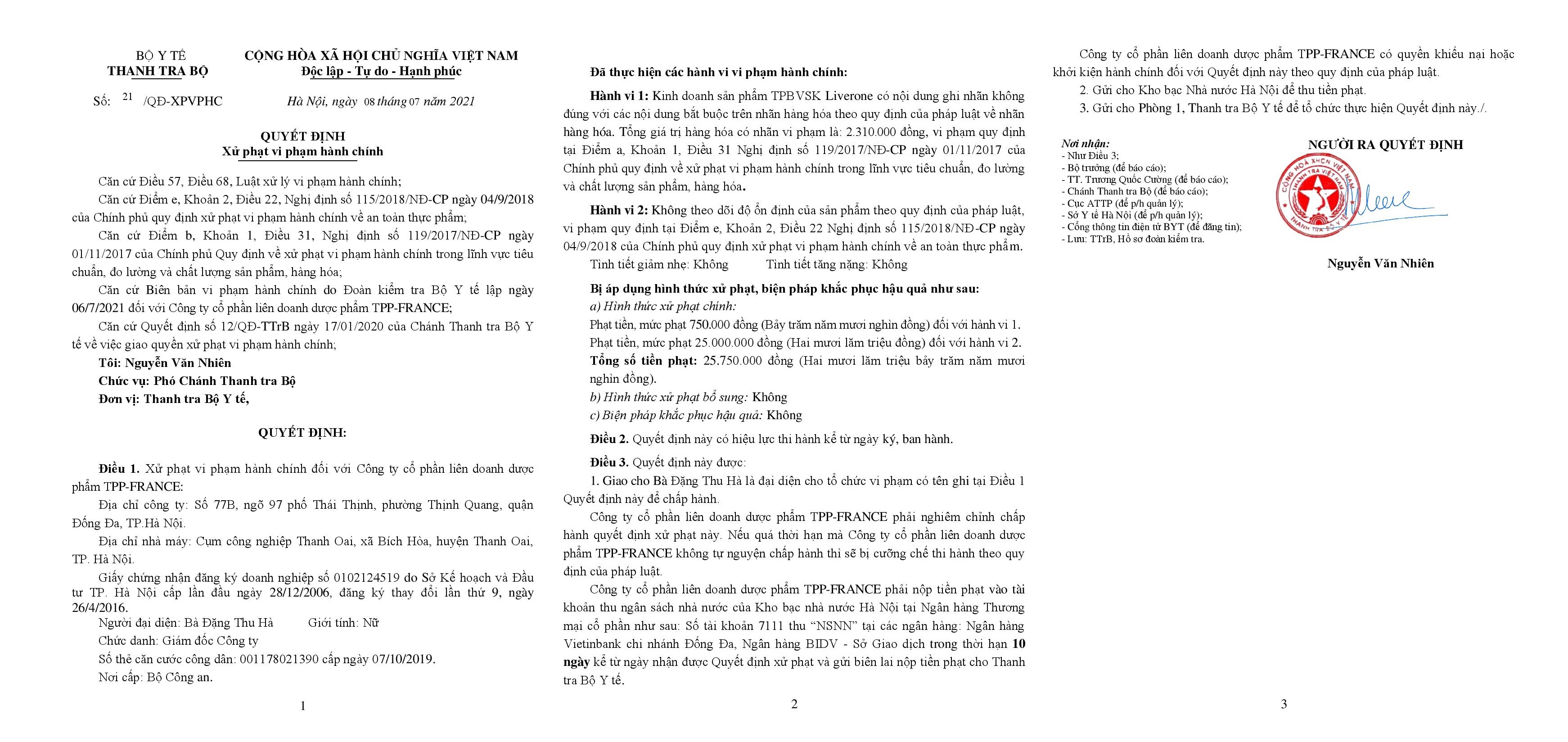 Dược phẩm TPPFRANCE bị xử phạt do kinh doanh sản phẩm có nội dung ghi nhãn không đúng quy định.