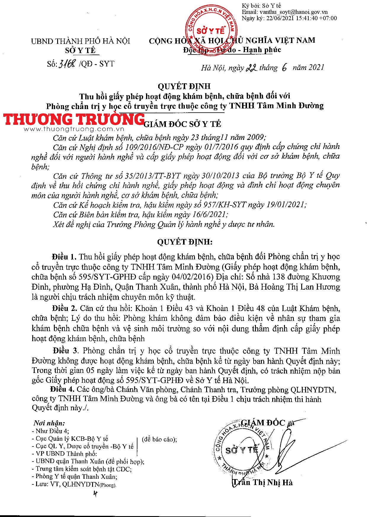 Ngày 22/06/2021, Giám đốc Sở Y tế Hà Nội ký quyết định số 3168/QĐ-SYT về việc “Thu hồi giấy phép hoạt động khám bệnh, chữa bệnh đối với Phòng chẩn trị y học cổ truyền trực thuộc Công ty TNHH Tâm Minh Đường”.