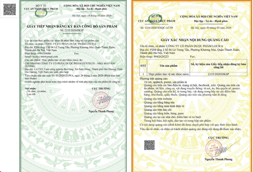 Cục An toàn thực phẩm (Bộ Y tế) vừa có Quyết định thu hồi hiệu lực Giấy xác nhận nội dung quảng cáo Thực phẩm bảo vệ sức khỏe Zawa.