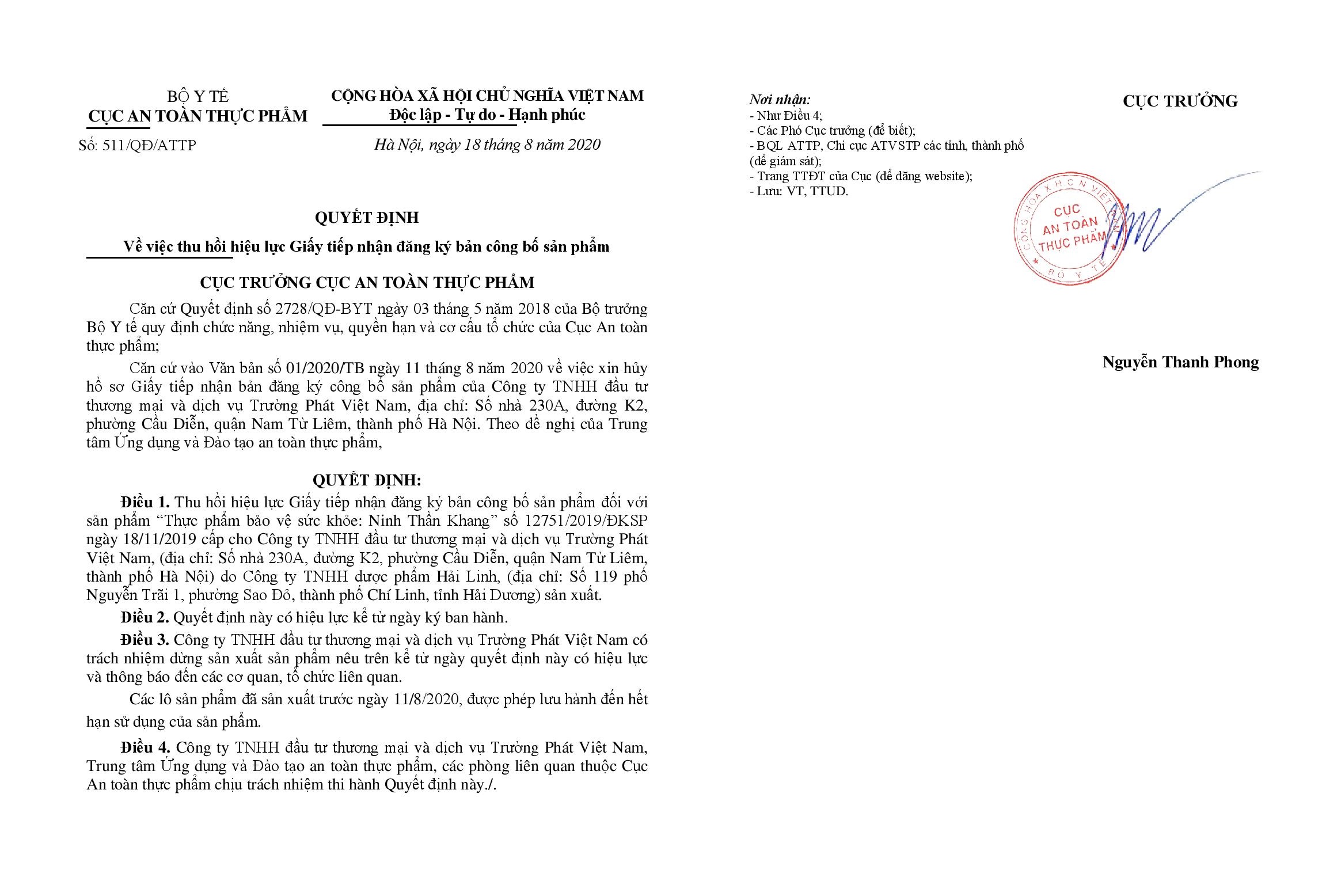 Cục An toàn thực phẩm đã có Quyết định số 511/QĐ-ATTP về việc thu hồi hiệu lực Giấy tiếp nhận đăng ký bản công bố sản phẩm đối với Thực phẩm bảo vệ sức khỏe Ninh Thần Khang số 12751/2019/ĐKSP ngày 18/11/2019 cấp cho công ty này.