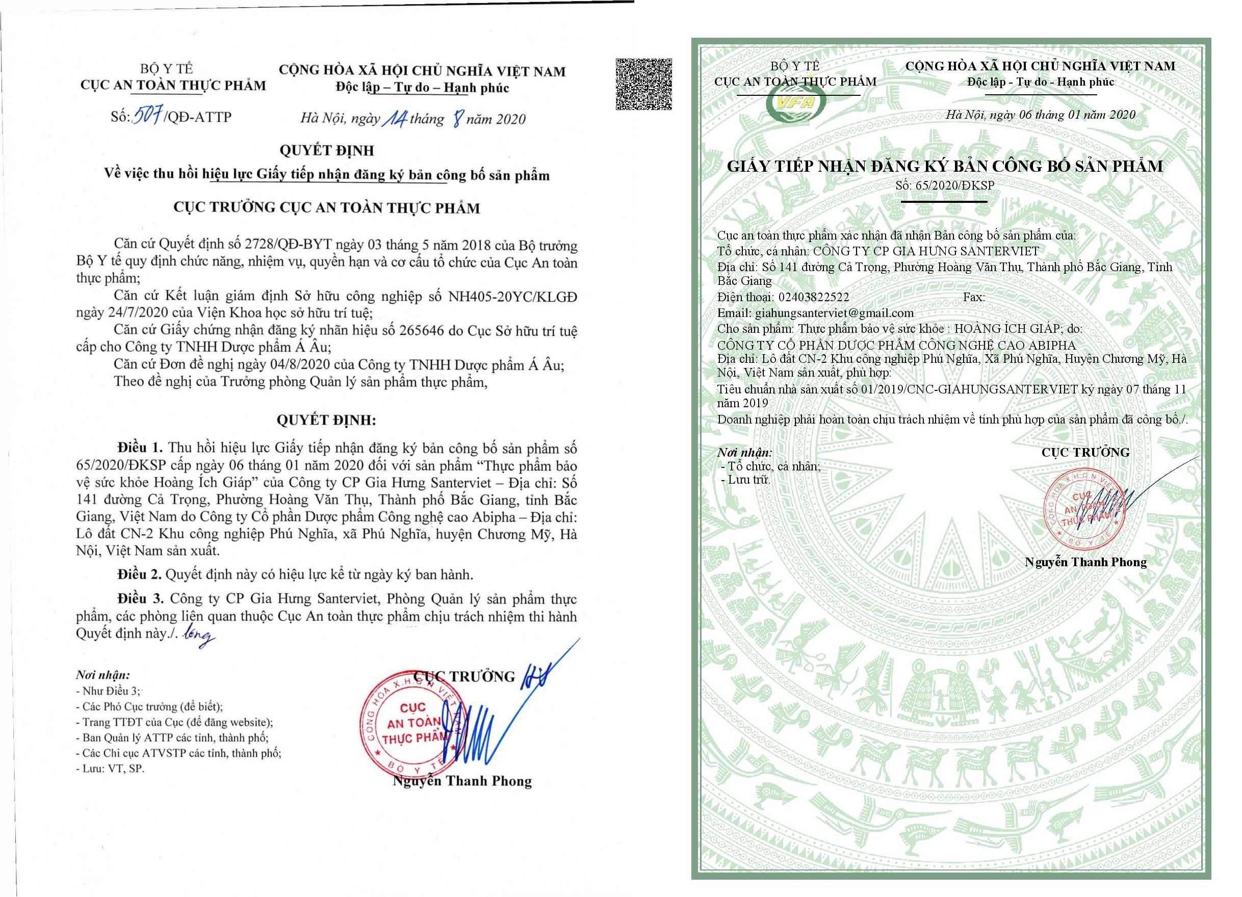 Cụ thể, Cục An toàn thực phẩm đã ban hành Quyết định số 507/QĐ-ATTP về việc thu hồi hiệu lực Giấy tiếp nhận đăng ký bản công bố sản phẩm số 65/2020/ĐKSP cấp ngày 06 tháng 01 năm 2020 đối với Thực phẩm bảo vệ sức khỏe Hoàng Ích Giáp do Công ty Cổ phần Gia Hưng Santerviet (Địa chỉ: Số 141 đường Cả Trọng, phường Hoàng Văn Thụ, thành phố Bắc Giang, tỉnh Bắc Giang) công bố và chịu trách nhiệm.
