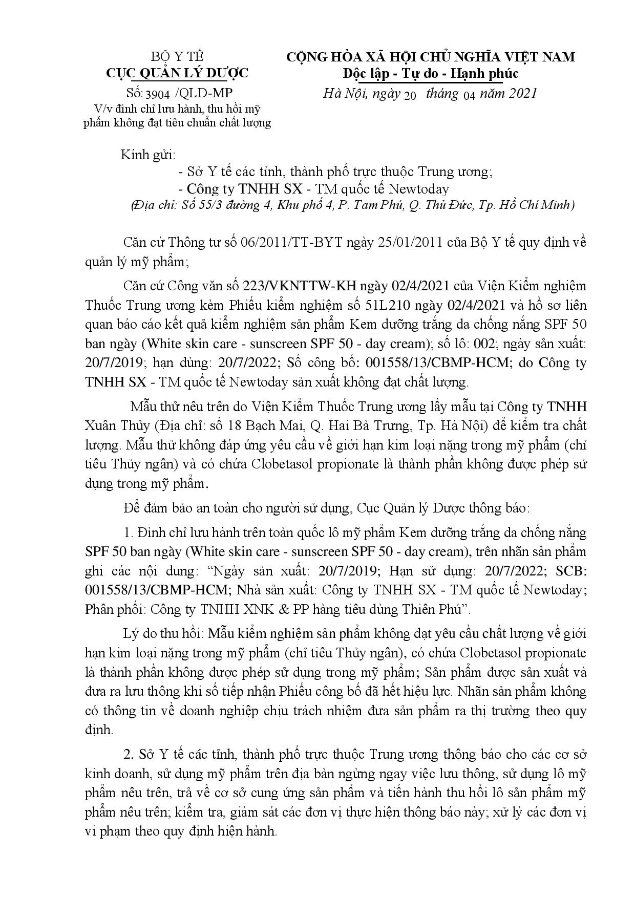 Cục Quản lý Dược vừa mới đây đã ban hành thông báo đình chỉ lưu hành, thu hồi toàn quốc đối với Kem dưỡng trắng da chống nắng SPF 50 ban ngày do Công ty TNHH SX - TM quốc tế Newtoday sản xuất, sau khi phát hiện sản phẩm mỹ phẩm này có chứa chất cấm và chỉ tiêu thủy ngân vượt giới hạn cho phép.