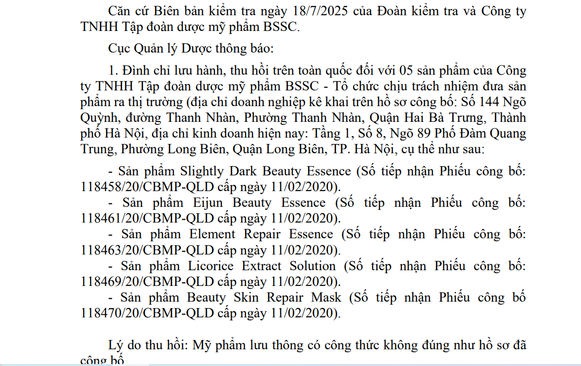 Theo đó, Cục Quản lý Dược thông báo đình chỉ lưu hành, thu hồi trên toàn quốc đối với 05 sản phẩm của Công ty TNHH Tập đoàn dược mỹ phẩm BSSC - Tổ chức chịu trách nhiệm đưa sản phẩm ra thị trường (địa chỉ doanh nghiệp kê khai trên hồ sơ công bố: Số 144 Ngõ Quỳnh, đường Thanh Nhàn, Phường Thanh Nhàn, Quận Hai Bà Trưng, Thành phố Hà Nội, địa chỉ kinh doanh hiện nay: Tầng 1, Số 8, Ngõ 89 Phố Đàm Quang Trung, Phường Long Biên, Quận Long Biên, TP. Hà Nội.