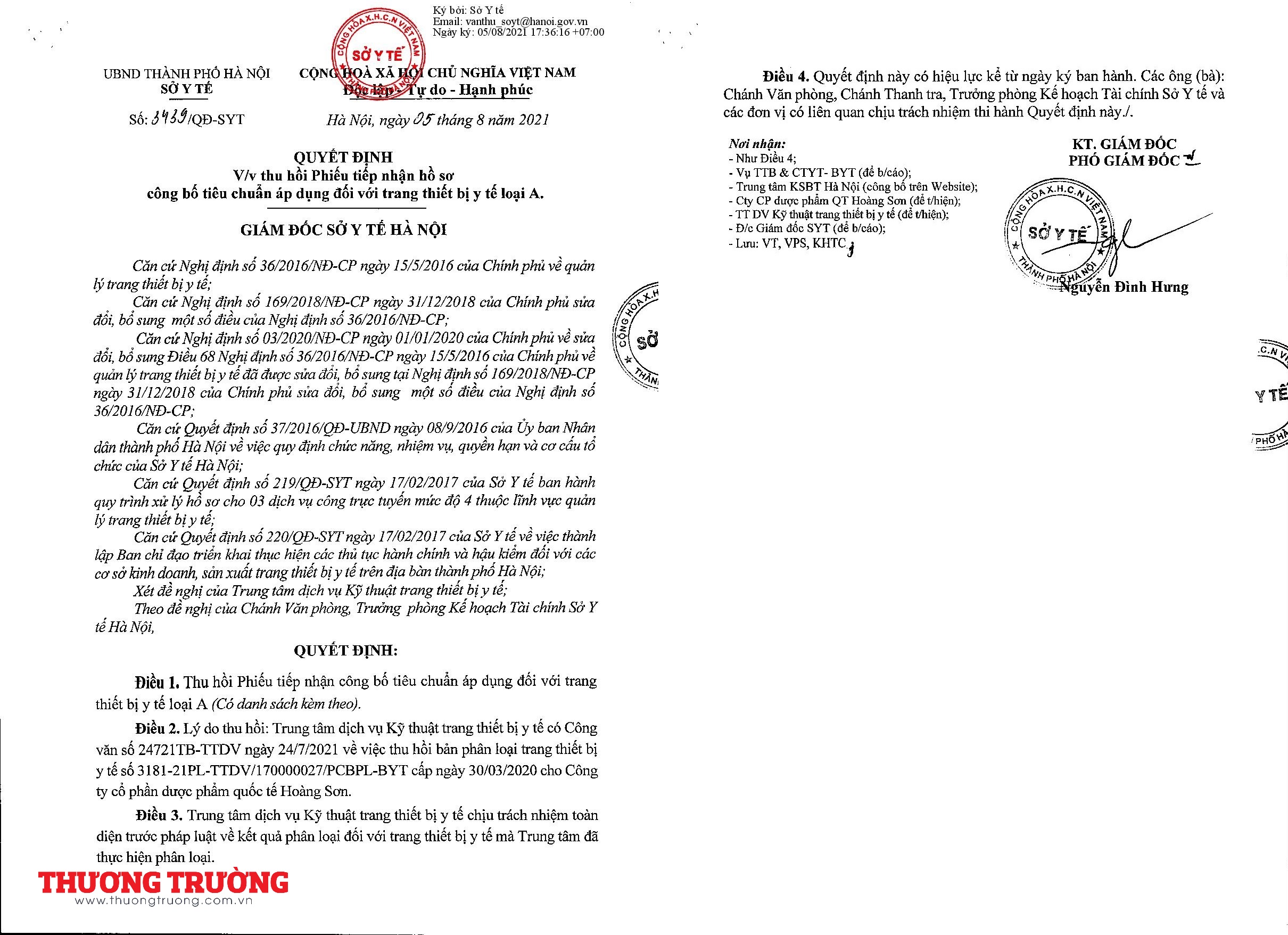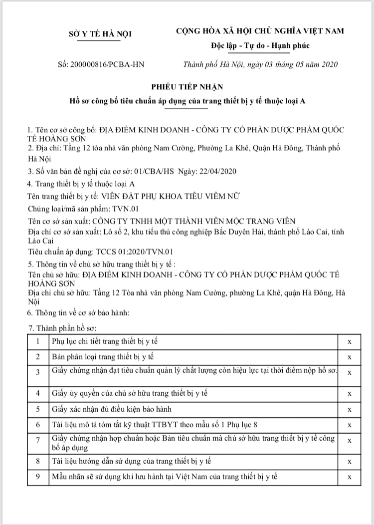 Căn cứ công văn của Trung tâm dịch vụ kỹ thuật thiết bị y tế, Sở Y tế TP.Hà Nội ban hành quyết định số 3439/QĐ-SYT về việc thu hồi Phiếu tiếp nhận công bố tiêu chuẩn (số phiếu: 200000816/PCBA-HN) đối với Trang thiết bị y tế loại A Viên đặt phụ khoa Tiêu viêm nữ, cấp cho Công ty cổ phẩn dược phẩm quốc tế Hoàng Sơn ngày 03/05/2020.