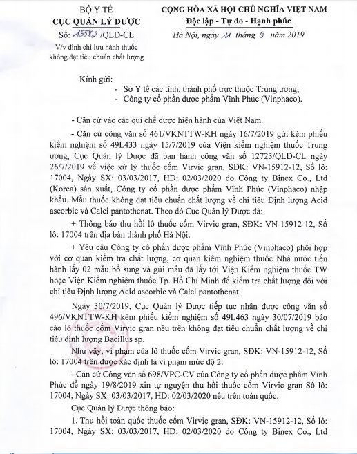 Theo đó, Cục Quản lý Dược yêu cầu Công ty cổ phần dược phẩm Vĩnh Phúc (Vinphaco) phối hợp với nhà cung cấp và phân phối thuốc, trong thời hạn 48h kể từ ngày ký Công văn này, gửi thông báo thu hồi tới các cơ sở bán buôn, bán lẻ, sử dụng lô Thuốc cốm Virvic gran nói trên và tiến hành thu hồi toàn bộ lô thuốc không đạt tiêu chuẩn chất lượng.