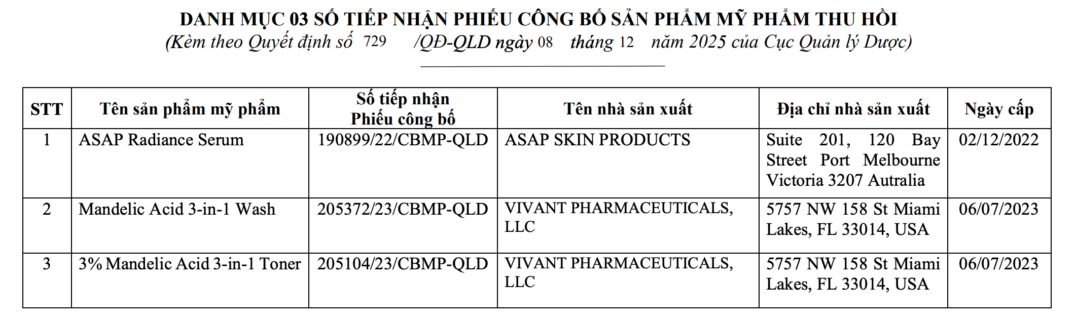 Theo Quyết định 729/QĐ-QLD ký ngày 8/12/2025, Cục Quản lý Dược đã thu hồi ba số tiếp nhận Phiếu công bố mỹ phẩm do Công ty TNHH Thẩm mỹ Zacy đứng tên. Các sản phẩm gồm: ASAP Radiance Serum; Mandelic Acid 3-in-1 Wash; và 3% Mandelic Acid 3-in-1 Toner. Đây đều là sản phẩm do hai nhà sản xuất tại Australia và Hoa Kỳ sản xuất, Zacy chịu trách nhiệm đưa ra thị trường.