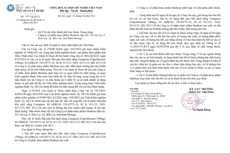Ngày 16/9, Phó cục trưởng Cục Quản lý Dược Tạ Mạnh Hùng ký văn bản thông báo thu hồi trên toàn quốc lô thuốc bột pha hỗn dịch uống Compacin (Ciprofloxacin 250mg) vi phạm mức độ 2 do Công ty cổ phần dược phẩm Medisun sản xuất.