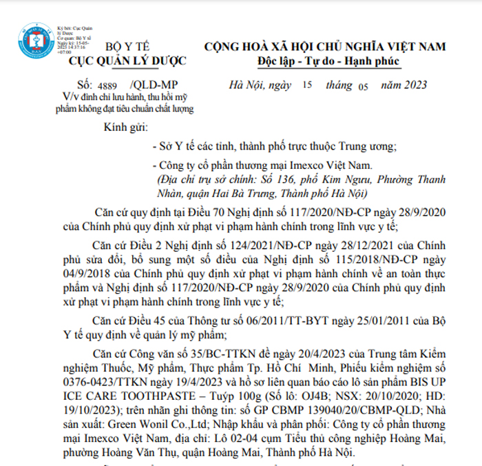 Cụ thể, tại Quyết định 4889/QLD-MP ngày 15/05/2023, Cục Quản lý Dược thông báo đình chỉ lưu hành, thu hồi trên toàn quốc lô sản phẩm Bis Ice Care Toothpaste – Tuýp 100g (Số lô: OJ4B; NSX: 20/10/2020; HD: 19/10/2023); trên nhãn ghi thông tin: số GP CBMP 139040/20/CBMP-QLD; Nhà sản xuất: Green Wonil Co.,Ltd; Nhập khẩu và phân phối: Công ty cổ phần thương mại Imexco Việt Nam, địa chỉ: Lô 02-04 cụm Tiểu thủ công nghiệp Hoàng Mai, phường Hoàng Văn Thụ, quận Hoàng Mai, Thành phố Hà Nội.