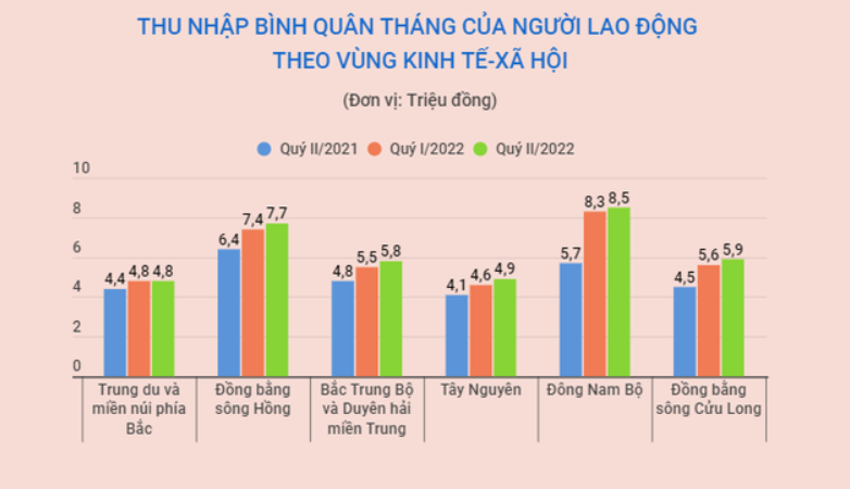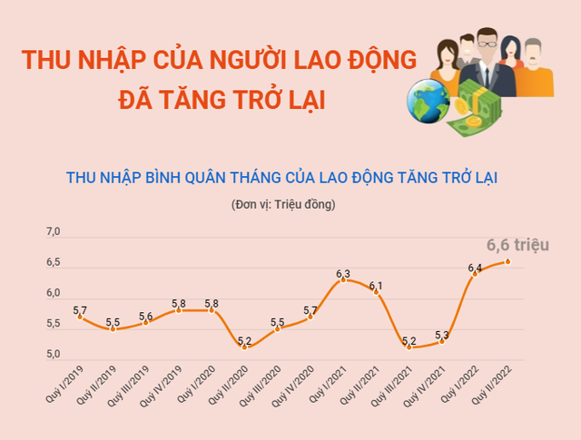 Theo kết quả khảo sát của Tổng cục Thống kê, thu nhập bình quân tháng của người lao động trong quý II vừa qua là 6,6 triệu đồng, tăng 206.000 đồng so với quý I/2022 và tăng 542.000 đồng so với cùng kỳ năm trước.