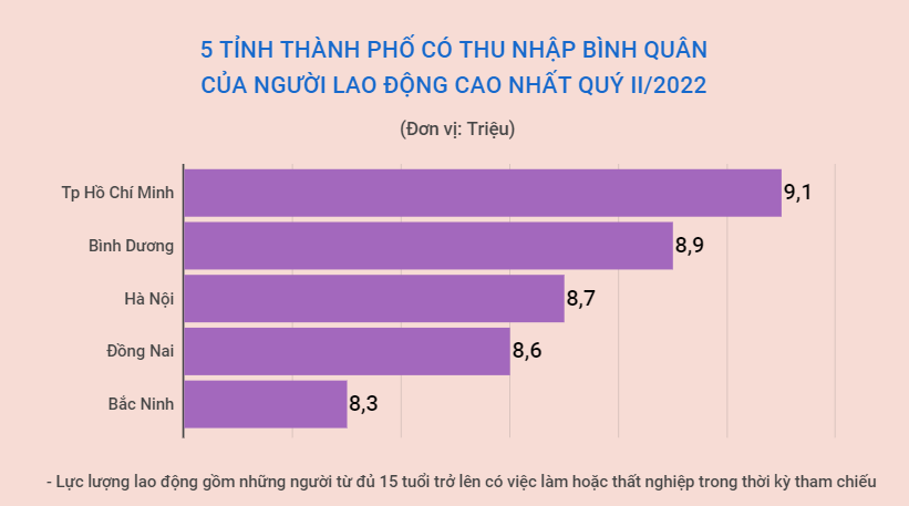 Hiện nay, lực lượng lao động tăng nhanh, số lao động bị ảnh hưởng tiêu cực do dịch COVID-19 giảm mạnh, đặc biệt thu nhập bình quân tháng của lao động đã tăng trở lại, trong đó, 5 tỉnh, thành phố có thu nhập bình quân của người lao động cao nhất quý II/2022 lần lượt là TP Hồ Chí Minh, Bình Dương, Hà Nội, Đồng Nai và Bắc Ninh.