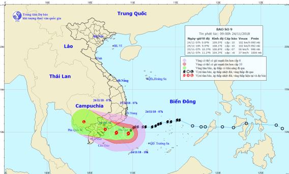 Dự báo trong 12 giờ tới, bão di chuyển theo hướng Tây mỗi giờ đi được khoảng 10-15km. Đến 19 giờ ngày 24/11, vị trí tâm bão ở khoảng 9,9 độ Vĩ Bắc; 108,1 độ Kinh Đông, ngay trên vùng biển các tỉnh từ Bình Thuận đến Bến Tre. Sức gió mạnh nhất vùng gần tâm bão mạnh cấp 9-10 (75-100km/giờ), giật cấp 12. Bán kính gió mạnh cấp 6, giật cấp 8 khoảng 150km tính từ tâm bão; bán kính gió mạnh cấp 10, giật cấp 12 khoảng 50km.