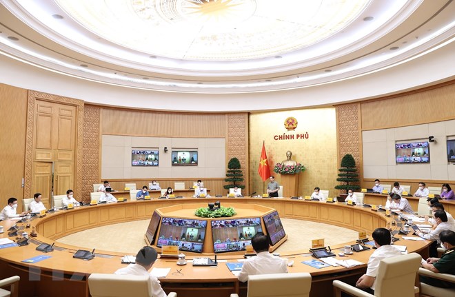 Quang cảnh cuộc họp trực tuyến tại điểm cầu Chính phủ. (Ảnh: Dương Giang/TTXVN)