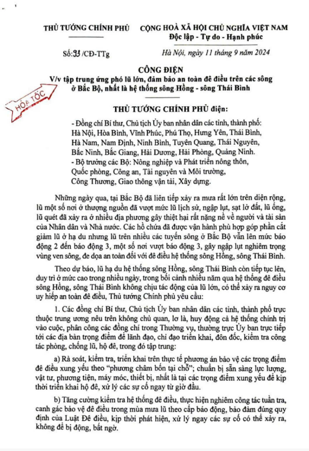Công điện số 93/CĐ-TTg ngày 11/9/2024 về việc tập trung ứng phó lũ lớn, đảm bảo an toàn đê điều trên các sông ở Bắc Bộ, nhất là hệ thống sông Hồng - sông Thái Bình.