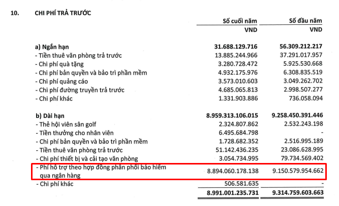 Đáng chú ý, phần lớn tài sản dài hạn khác (8.959 tỷ đồng) là phí trả trước trong hợp đồng phân phối bảo hiểm qua ngân hàng (bancassurance), cụ thể là với TPBank và ACB. Chi phí trả trước cho các hợp đồng bancassurance được ghi nhận như một phần lớn trong tài sản dài hạn, nhưng không tạo ra hiệu quả lợi nhuận ngắn hạn, khiến hiệu quả sử dụng vốn của doanh nghiệp bị đặt dấu hỏi.