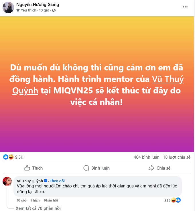 Hoa hậu chuyển giới viết: "Dù muốn dù không thì cũng cảm ơn em đã đồng hành. Hành trình mentor của Vũ Thuý Quỳnh tại MIQVN25 sẽ kết thúc từ đây do việc cá nhân!".