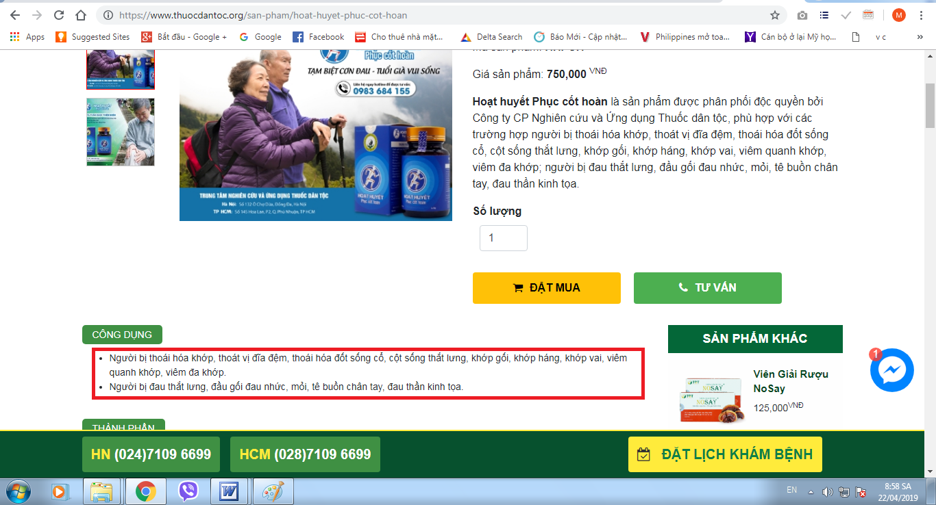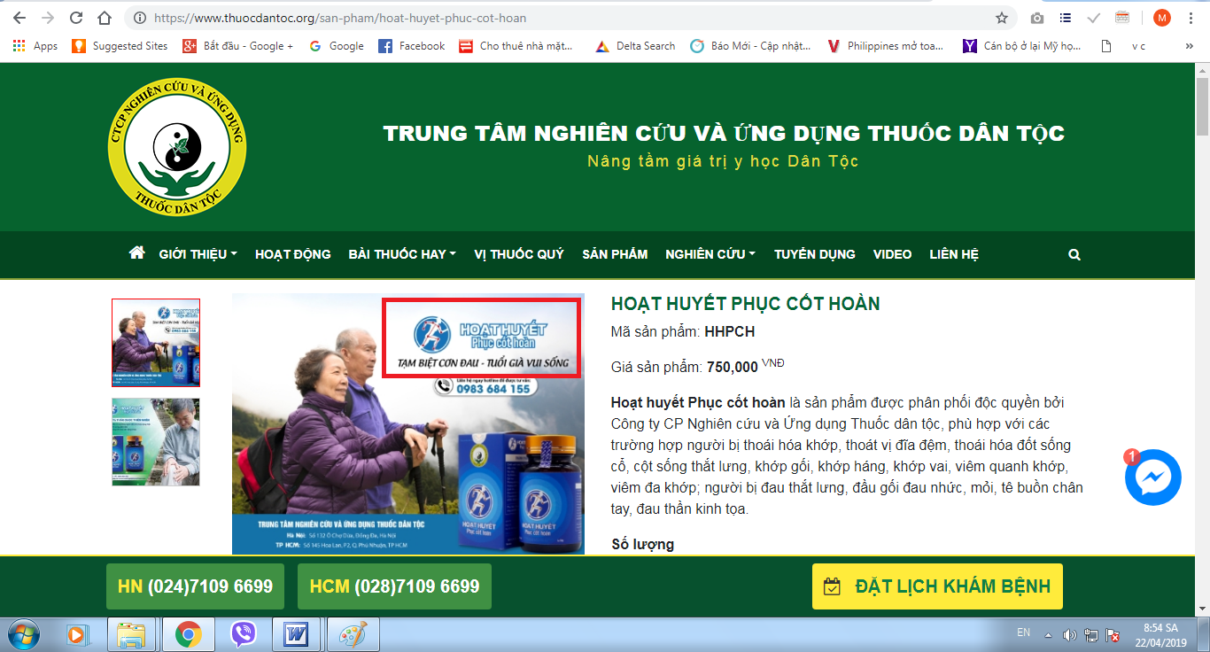Qua rà soát vào sáng ngày 22/4/2019, mức độ vi phạm trên trang www.thuocdantoc.vn còn khủng hơn nhiều khi sản phẩm TPBVSK Hoạt huyết phục cốt hoàn được quảng cáo như thuốc chữa bệnh với những lời lẽ có cánh như: Hết đau lưng, đau đầu gối lâu năm nhờ Hoạt huyết Phục cốt hoàn, Hoạt huyết Phục cốt hoàn đẩy lùi bệnh xương khớp được hàng triệu bệnh nhân ưu tiên lựa chọn, bởi hiệu quả và an toàn trong điều trị… Đây là hành vi quảng cáo thực phẩm chức năng gây hiểu nhầm có tác dụng như thuốc chữa bệnh mà mới đây Công ty Nghiên cứu và ứng dụng Thuốc Dân tộc đã bị Cục An toàn thực phẩm xử phạt. Trên website này có tên của Công ty Nghiên cứu và ứng dụng Thuốc Dân tộc và Trung tâm Nghiên cứu và Ứng dụng Thuốc dân tộc – Số 132 Ô Chợ Dừa – Đống Đa – Hà Nội. Liệu đây có phải là sản phẩm quảng cáo của đơn vị này hay không?