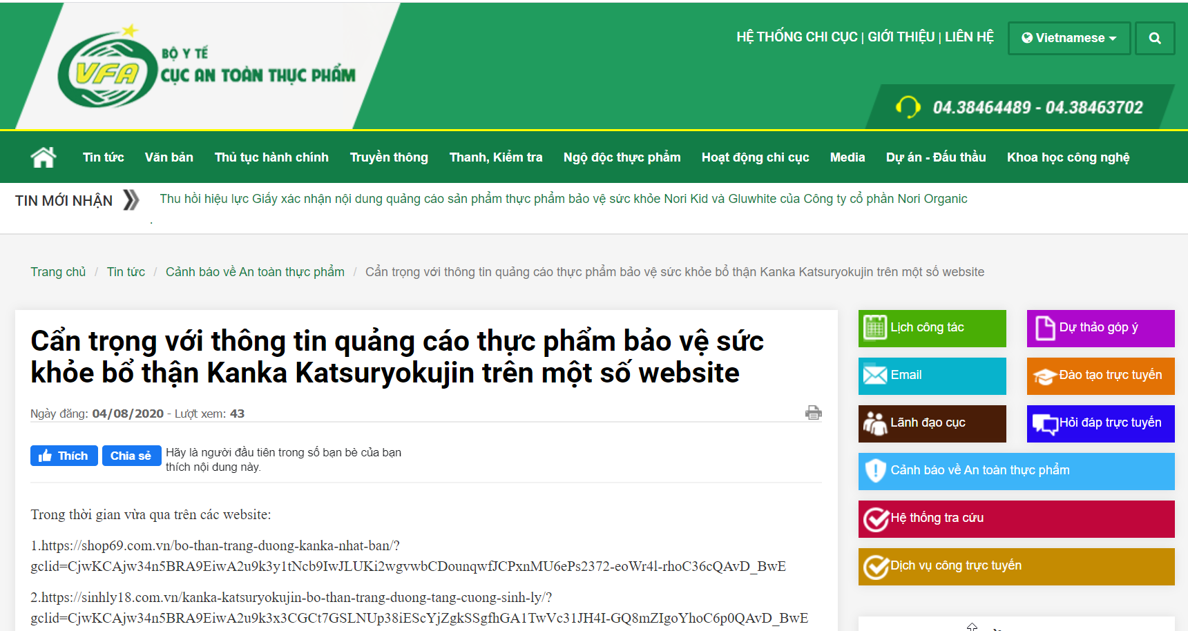 Cục An toàn thực phẩm (Bộ Y tế) cho biết thời gian vừa qua, qua công tác hậu kiểm việc quảng cáo thực phẩm bảo vệ sức khỏe trên internet và môi trường mạng, Cục đã phát hiện trên các website shop69.com.vn; ; sinhly18.com.vn; othankanka.com có nội dung quảng cáo sản phẩm thực phẩm bảo vệ sức khỏe bổ thận Kanka Katsuryokujin không đúng bản chất, lừa dối người tiêu dùng, vi phạm quy định pháp luật về quảng cáo.