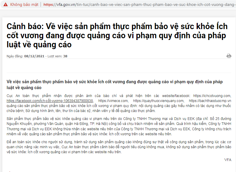 Theo đó, Cục An toàn thực phẩm nhận được phản ánh của báo chí và phát hiện trên các website/facebook: https://ichcotvuong.com, https://facebook.com/Ích-cốt-vương-106394387900838, https://vimece.com, https://quaythuocvienquany.com, https://bachthaoduocmp.vn quảng cáo sản phẩm thực phẩm bảo vệ sức khỏe Ích cốt vương vi phạm quy định: nội dung quảng cáo gây hiểu nhầm có tác dụng như thuốc chữa bệnh; Sử dụng hình ảnh, tên, thư tín của bác sỹ, nhân viên y tế để quảng cáo thực phẩm.