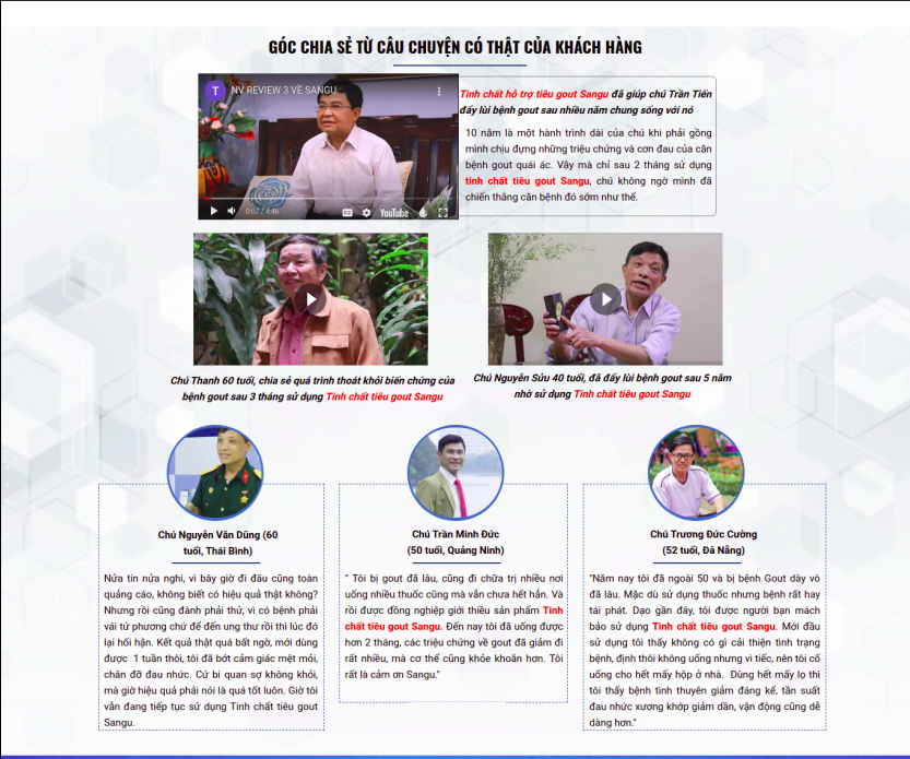 Để “thổi phồng" công dụng, lấy lòng tin của người tiêu dùng, các website này đăng tải hình ảnh của nhiều bệnh nhân như: Tinh chất hỗ trợ tiêu gout Sangu đã giúp chú Trần Tiến đẩy lùi bệnh gout sau nhiều năm chung sống với nó; Chú Thanh 60 tuổi, chia sẻ quá trình thoát khỏi biến chứng của bệnh gout sau 3 tháng sử dụng Tinh chất tiêu gout Sangu; Chú Nguyễn Sửu 40 tuổi, đã đẩy lùi bệnh gout sau 5 năm nhờ sử dụng Tinh chất tiêu gout Sangu...