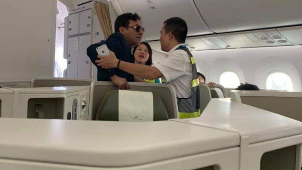 Nhân viên hàng không yêu cầu nam hành khách say xỉn, có hành vi sàm sỡ khách đi cùng rời khỏi máy bay. (Ảnh: Báo Giao thông). |
