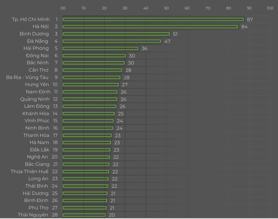 Báo cáo cũng chỉ ra, TP. Hồ Chí Minh tiếp tục dẫn đầu về xếp hạng Chỉ số Thương mại điện tử Việt Nam năm 2024 với 87 điểm. Đứng thứ hai là Hà Nội với 84,3 điểm. Đứng thứ ba trong bảng xếp hạng là Bình Dương với 51,3 điểm và cũng có khoảng cách rất xa so với Hà Nội lên tới 33 điểm.
