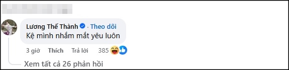 Đặc biệt, ông xã Lương Thế Thành cũng để lại bình luận công khai khen ngợi bà xã. Anh viết: "Kệ mình nhắm mắt yêu luôn".