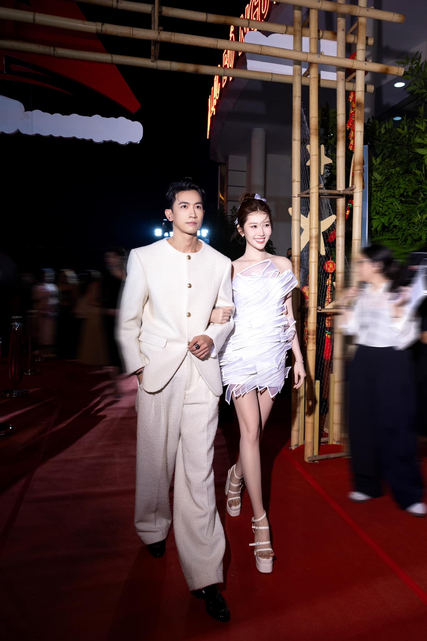 Ở event khác, sải bước trên thảm đỏ, Võ Cảnh và Thúy Ngân lên đồ ăn ý với sắc trắng tinh khôi.