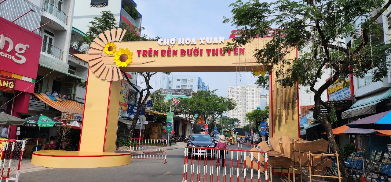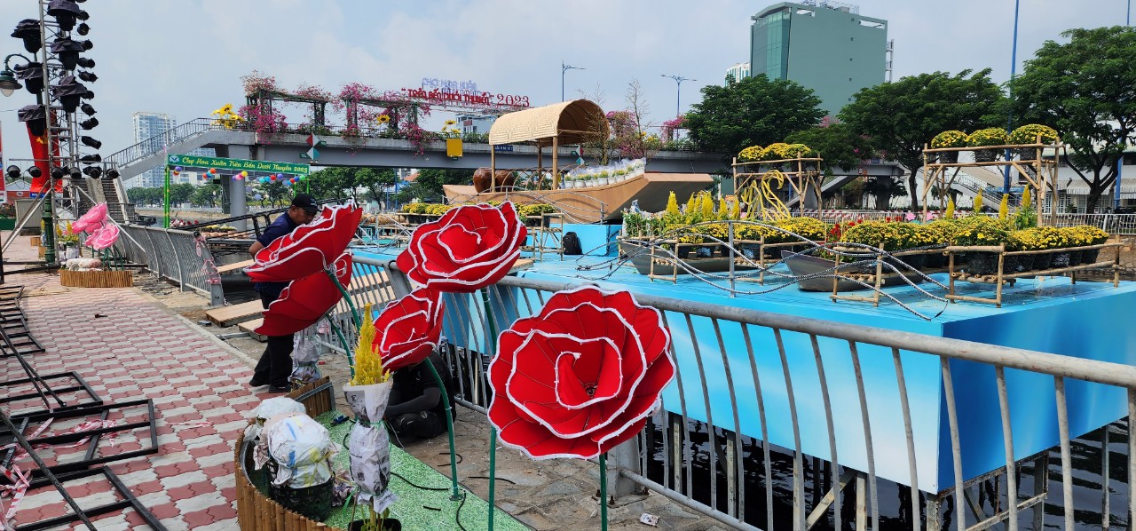 Ban tổ chức đang hoàn thiện những khâu cuối cùng về sân khấu, tiểu cảnh...để chuẩn bị cho lễ khai mạc Chợ Hoa Xuân “Trên bến dưới thuyền” Tết Quý Mão 2023 vào lúc 19 giờ 00, ngày 16/01/2023 (nhằm ngày 25 tháng Chạp âm lịch).