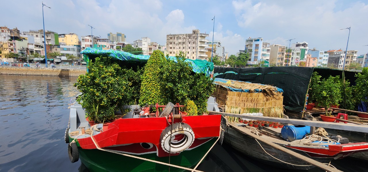 Ở đầu đường Bến Bình Đông, đoạn gần cầu Chà Và, một top khoảng gần chục chiếc thuyền chở cây quất (cây tắc) đang neo đậu và chuyển quất lên bờ phục vụ khách.