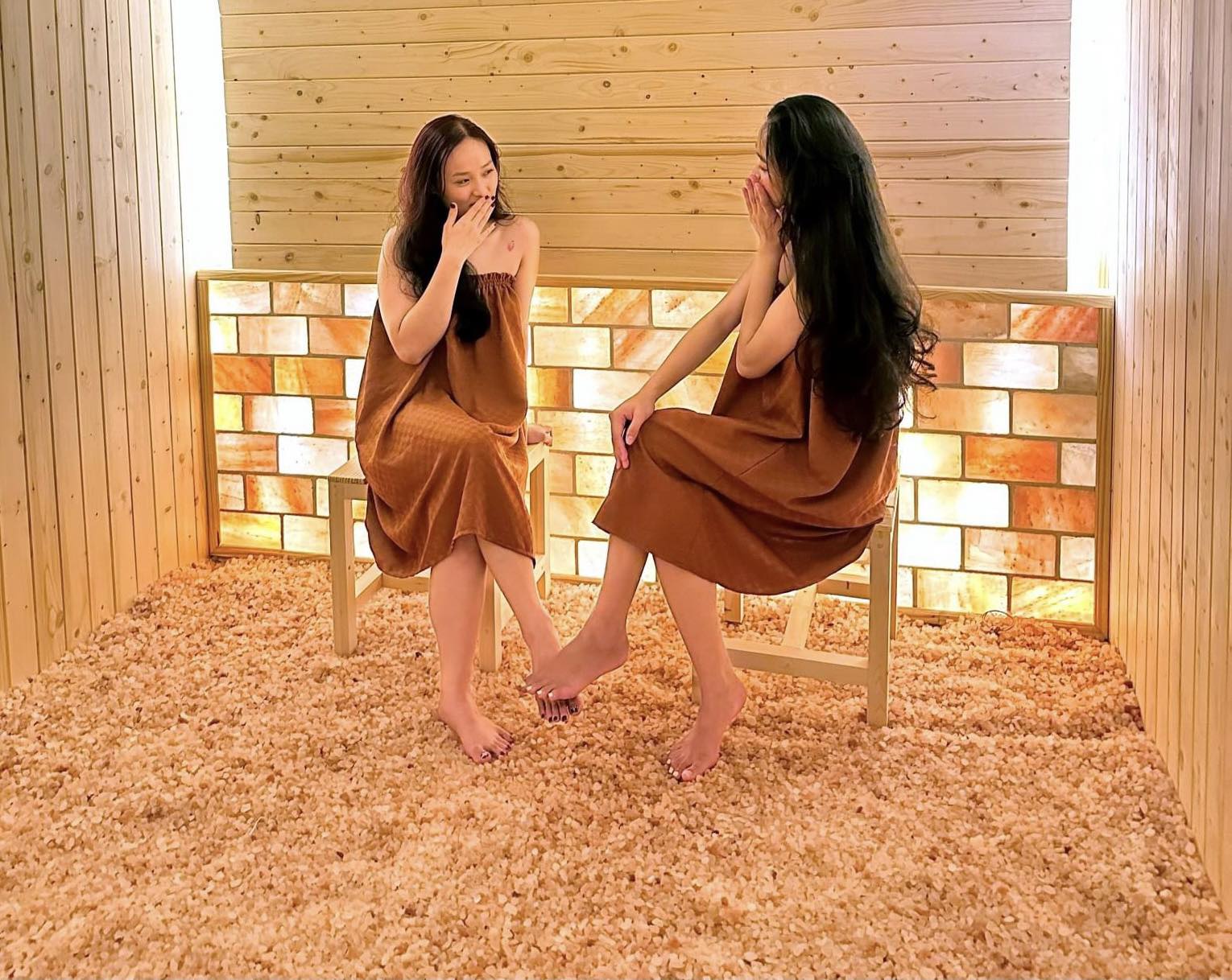 Đặc biệt, tại các tiệm spa đá muối được sử dụng rất phổ biến, chúng dùng để cho khách ngâm tắm, mát xa cơ thể, xông hơi và giảm béo. Một vài cơ sở chữa bệnh đông y cũng bắt đầu sử dụng hộp đá muối để mát xa chân và giường đá muối để mát xa cơ thể cho bệnh nhân.