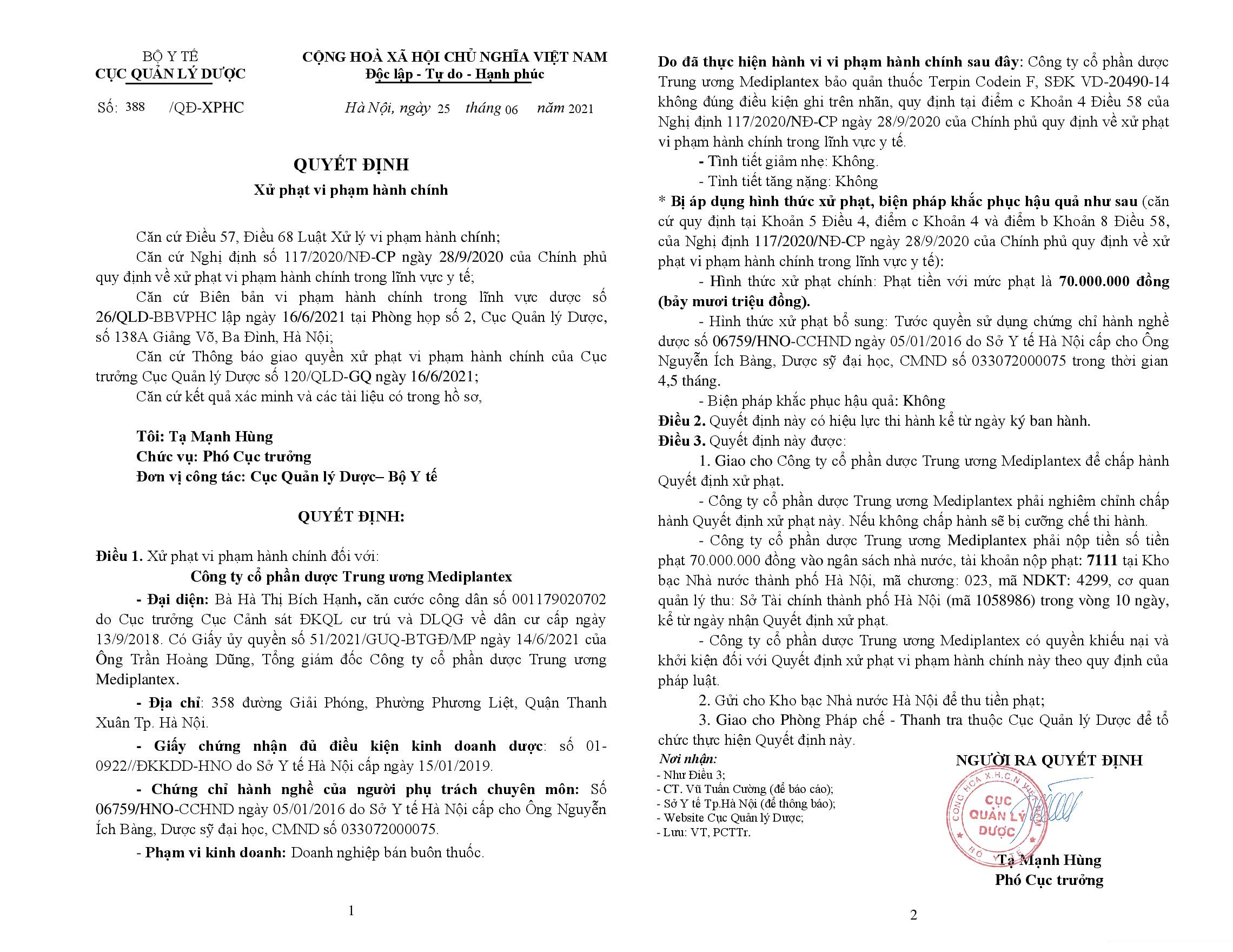 Với hành vi này, ngày 07/02/2018, Cục Quản lý Dược đã ban hành Quyết định số 84/QĐ – XPHC xử phạt vi phạm hành chính đối với Công ty cổ phần dược Trung ương Mediplantex, với mức phạt tiền là 70 triệu đồng.