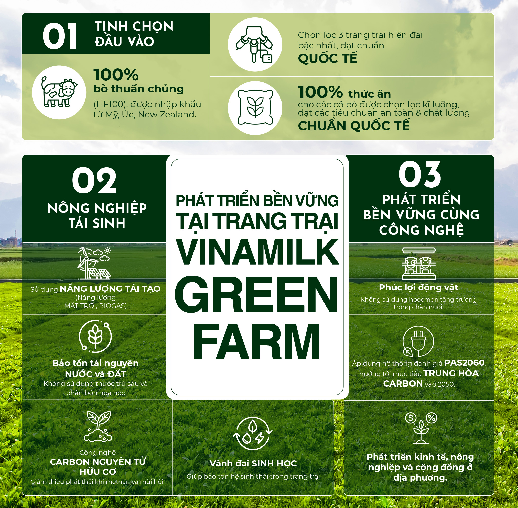 Không chỉ qua sản phẩm, mà các yếu tố bền vững được đẩy mạnh trong cả quá trình sản xuất với Trang trại sinh thái Vinamilk Green Farm được Vinamilk xây dựng. Mô hình này gồm 3 trụ cột chính làm định hướng cho phát triển bền vững, bao gồm: Chọn lọc đầu vào kĩ lưỡng, Thực hành nông nghiệp tái tạo và Ứng dụng công nghệ tiên tiến vào nông nghiệp bền vững.