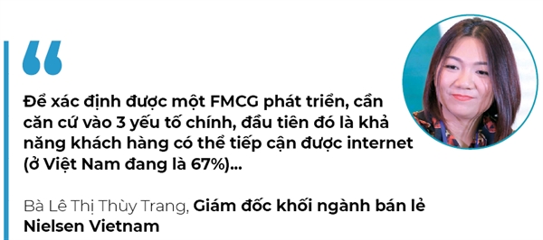 “Đối với những quốc gia như Việt Nam, yếu tố thu hút khách hàng từ nhu cầu tìm kiếm các sản phẩm có chi phí thấp, tiết kiệm qua các dịch vụ trung gian cần được tận dụng khi muốn tạo lập và phát triển FMCG”, bà Lê Thị Thùy Trang, Giám đốc khối ngành bán lẻ Nielsen Vietnam, cho biết. Để xác định được một FMCG phát triển cần căn cứ vào 3 yếu tố chính, đầu tiên là khả năng khách hàng có thể tiếp cận được internet (ở Việt Nam đang là 67%). Bên cạnh đó, niềm tin về triển vọng của nền kinh tế, tốc độ gia tăng dân số (95 triệu dân) cùng các lợi thế có thể nhận được sự hỗ trợ của nhà nước về FMCG.