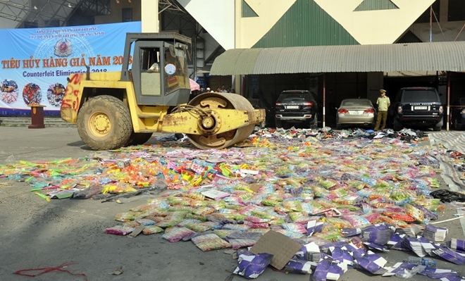 Hàng giả tiêu hủy chủ yếu là thực phẩm, mỹ phẩm, hàng tiêu dùng, quần áo, đồ chơi trẻ em mang tính bạo lực...với tổng giá trị tương đương với hàng thật khoảng 644 triệu đồng.
