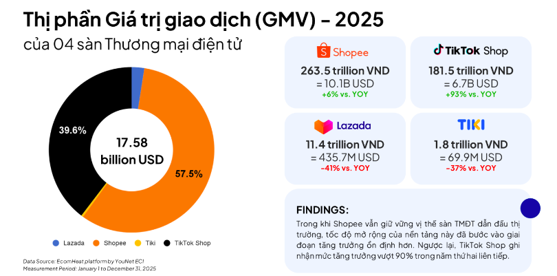 Theo báo cáo của YouNet ECI, năm 2025 thị trường thương mại điện tử Việt Nam tiếp tục tăng trưởng mạnh khi tổng GMV trên bốn nền tảng Shopee, TikTok Shop, Lazada và Tiki đạt 458.160 tỷ đồng, tăng 26% so với năm trước.