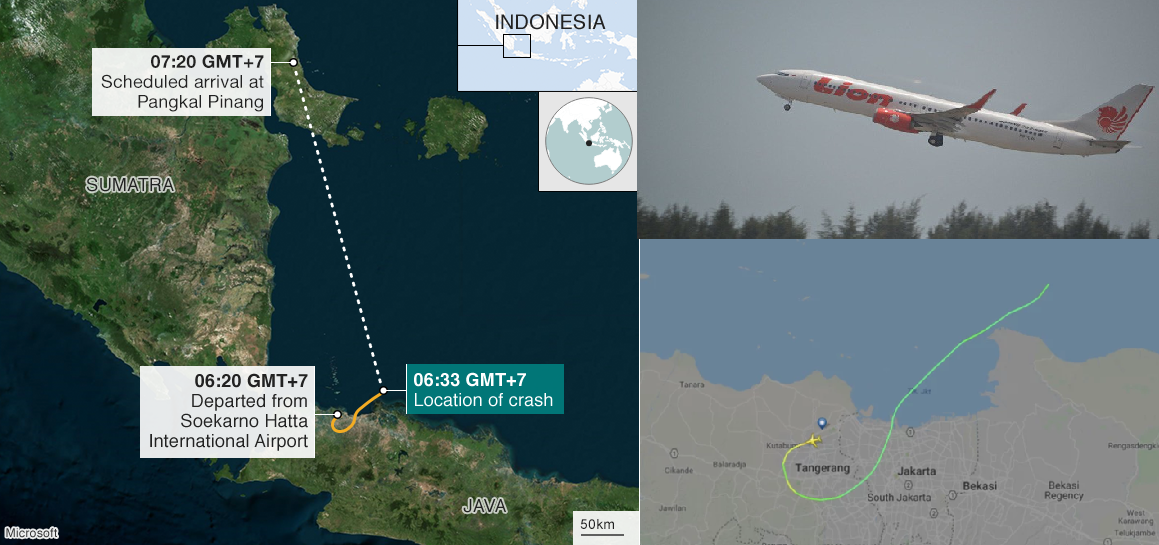 Chuyến bay số hiệu JT610 đâm xuống biển, ngoài khơi Indonesia, lúc 6h30 sáng 29/10 - giờ địa phương (Ảnh BBC) |