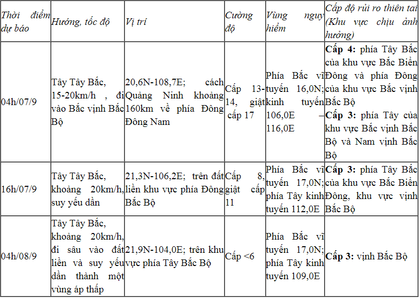 Mưa lớn: Từ đêm 06/9 đến sáng 09/9, ở khu vực Bắc Bộ và Thanh Hoá có khả năng xuất hiện một đợt mưa to, cục bộ có nơi mưa rất to và dông với tổng lượng mưa phổ biến từ 100-350mm, có nơi trên 500mm (mưa lớn nhất ở phía Đông Bắc Bộ tập trung trong ngày và đêm 07/9; phía Tây Bắc Bộ từ tối ngày 07/9 đến đêm 08/9). Mưa lớn có khả năng gây ra tình trạng ngập úng tại các vùng trũng, thấp; lũ quét trên các sông, suối nhỏ, sạt lở đất trên sườn dốc.